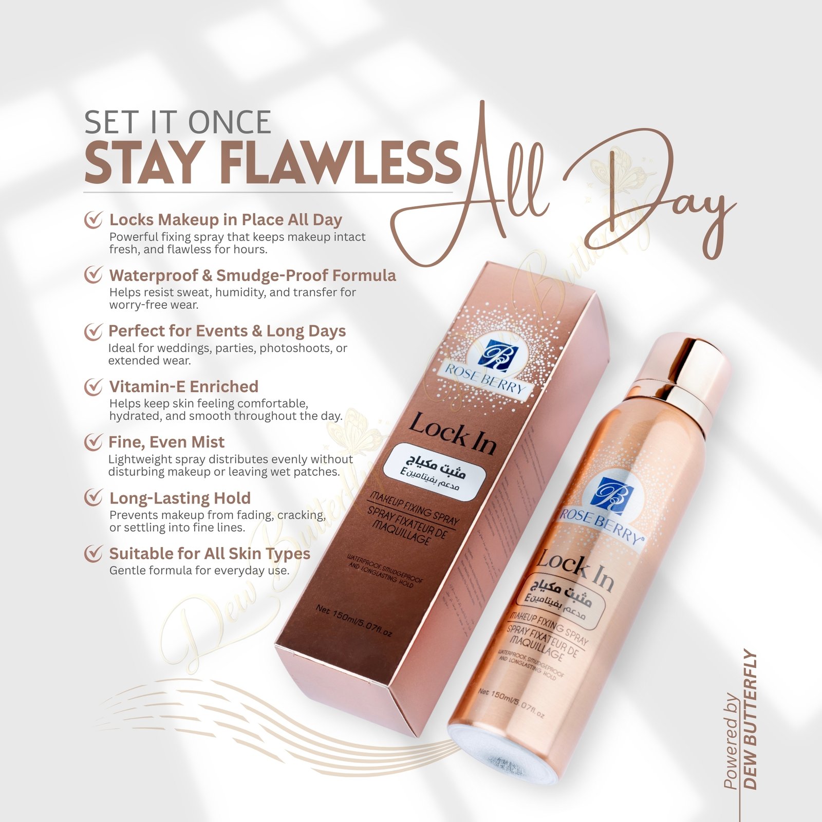 Roseberry Lock-In Setting SprayĀ keeps your makeup fresh, flawless, and long-lasting all day. Its lightweight, non-sticky formula locks makeup in place while giving a natural, smooth finish.