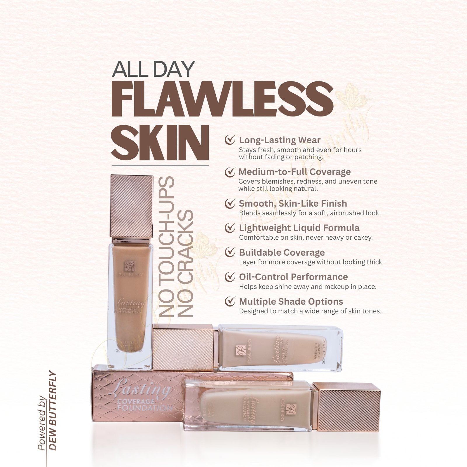 Suitable for all skin types, Roseberry Long Lasting Waterproof Foundation enhances your natural beauty with a fresh, flawless complexion that lasts from morning to night.