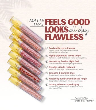 A weightless filler-effect matte lipgloss lipstick that delivers intense color, smooth coverage, and long-lasting comfort. Dew Butterflyās signature formula gives fuller-looking lips with a soft matte finishāwithout dryness.